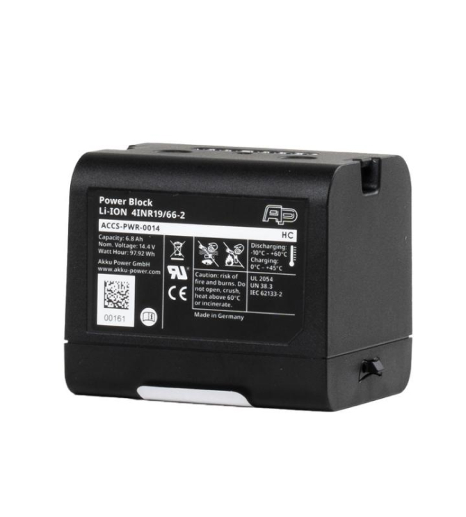 The lithium ion battery can be used as additional or replacement battery. The PowerBlock is compatible with the terrestrial laser scanners FARO Focus S and M, Focus Premium and Focus Core, as well as ScanLocalizer.